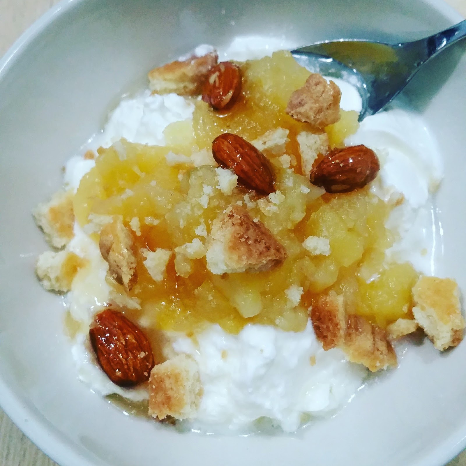 | Un dessert improvisé : Faisselle, compote de pommes maison, miel aux amandes et biscuits |